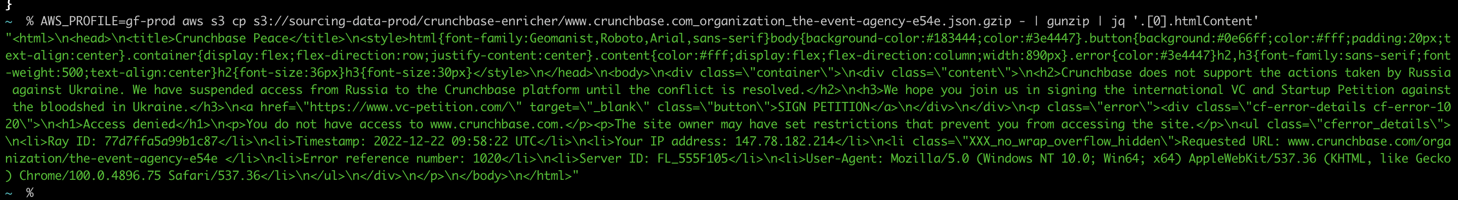 AWS_PROFILE=gf-prod aws s3 cp s3://sourcing-data-prod/crunchbase-enricher/www.crunchbase.com_organization_the-event-agency-e54e.json.gzip - | gunzip | jq -r '.[0].htmlContent'